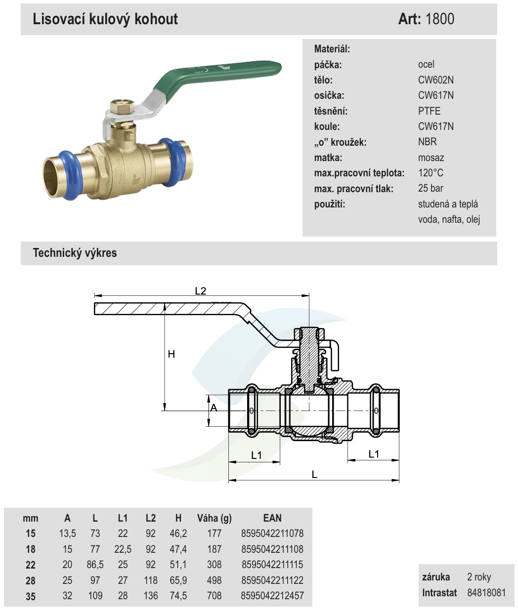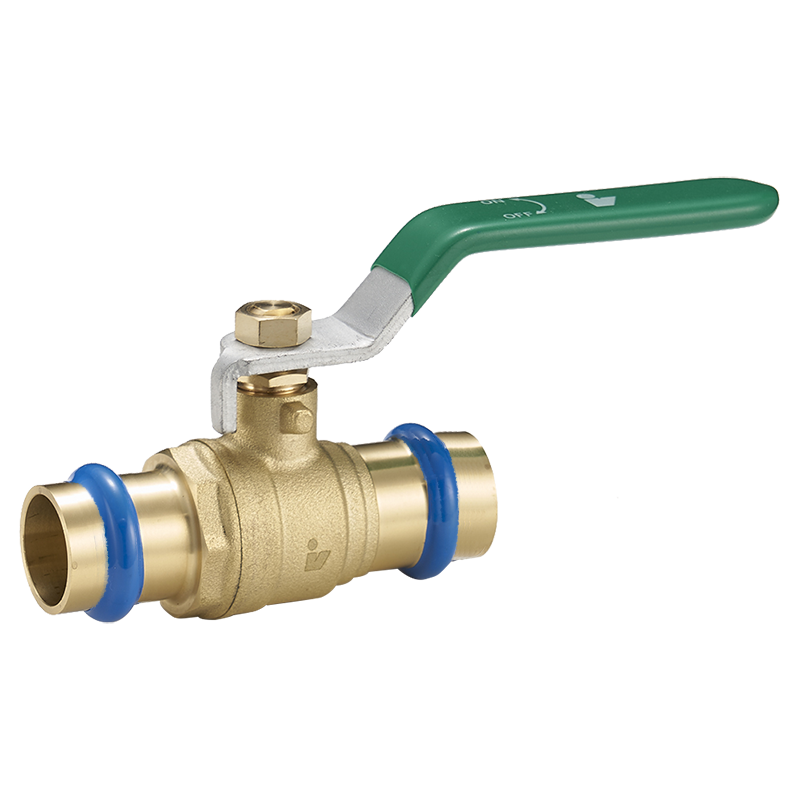 Mosazný kulový lisovací kohout art.1800 Kvalitní kulový kohout určený pro lisování čelistmi s profilem V. Pro teploty od -20°C (pozor - kapalina v kohoutu nesmí zamrznout!) do +120°C a tlak do 25 barů.