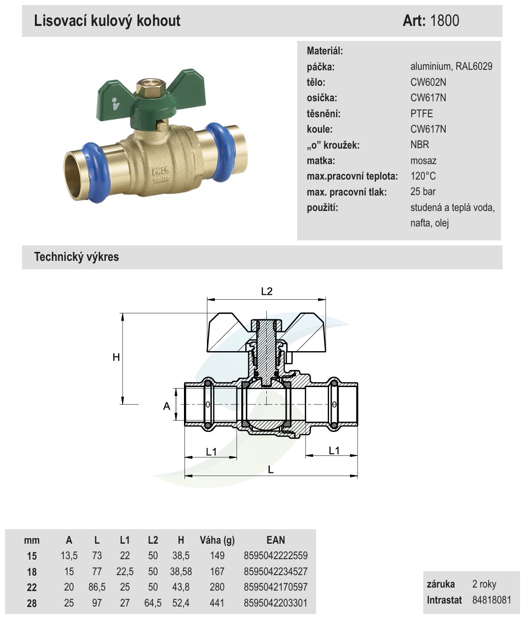 Mosazný kulový lisovací kohout art.1800 Kvalitní kulový kohout určený pro lisování čelistmi s profilem V. Pro teploty od -20°C (pozor - kapalina v kohoutu nesmí zamrznout!) do +120°C a tlak do 25 barů.