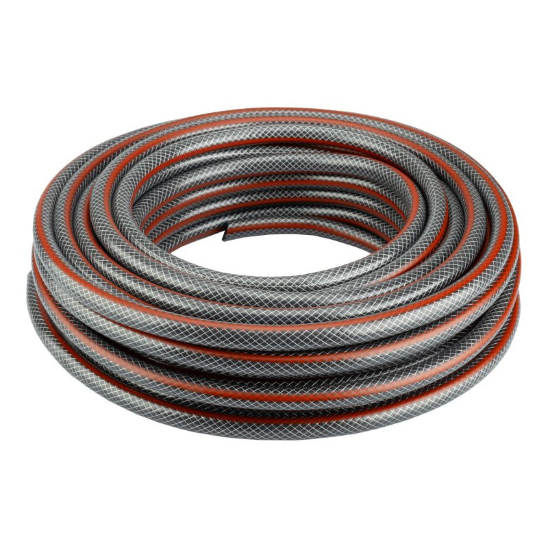 Hadice je vyrobena z pružného měkčeného PVC a vyztužena polyesterovým opletem, který zajišťuje stabilní tvar a spolehlivý průtok vody. Vnitřní černá vrstva zabraňuje tvorbě řas, což přispívá k hygienickému provozu a delší životnosti hadice. Vnější plášť je odolný vůči UV záření i povětrnostním vlivům.