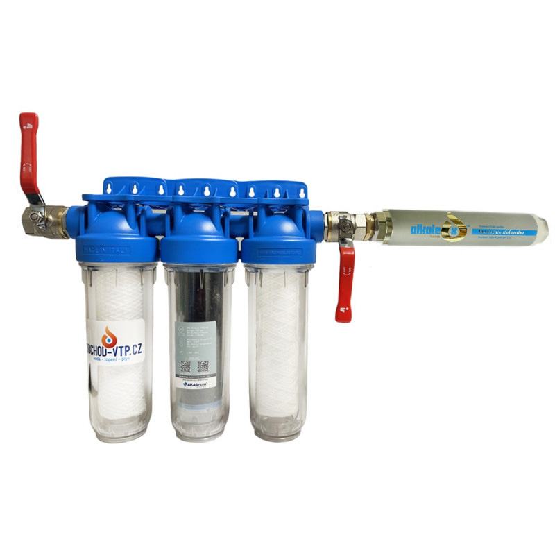 SET OBSAHUJE: TROJITÝ FILTR ATLAS VČETNĚ DRŽÁKU A KLÍČE, KOMLETNÍ SADU FILTRAČNÍCH PATRON VIZ PŘÍSLUŠENSTVÍ, MONTÁŽNÍ PRVKY, TVAROVKY A KULOVÉ KOHOUTY PRO HORIZONTÁLNÍ ČI VERTIKÁLNÍ MONTÁŽ A IPS ALKALEX HOME - iontový změkčovač vody.